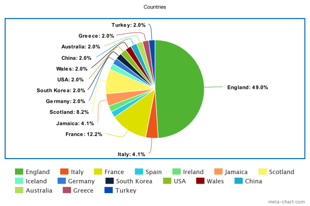 Sadly, this is down from 22 countries in 2018 and 21 in 2017 – I’ll have to make more effort next year! As usual, I have read more books set in my own country (England) than any other, which is not a deliberate choice but more a reflection of the subjects and time periods I tend to be drawn to. France and Scotland were in second and third place this year (the opposite way round from last year).