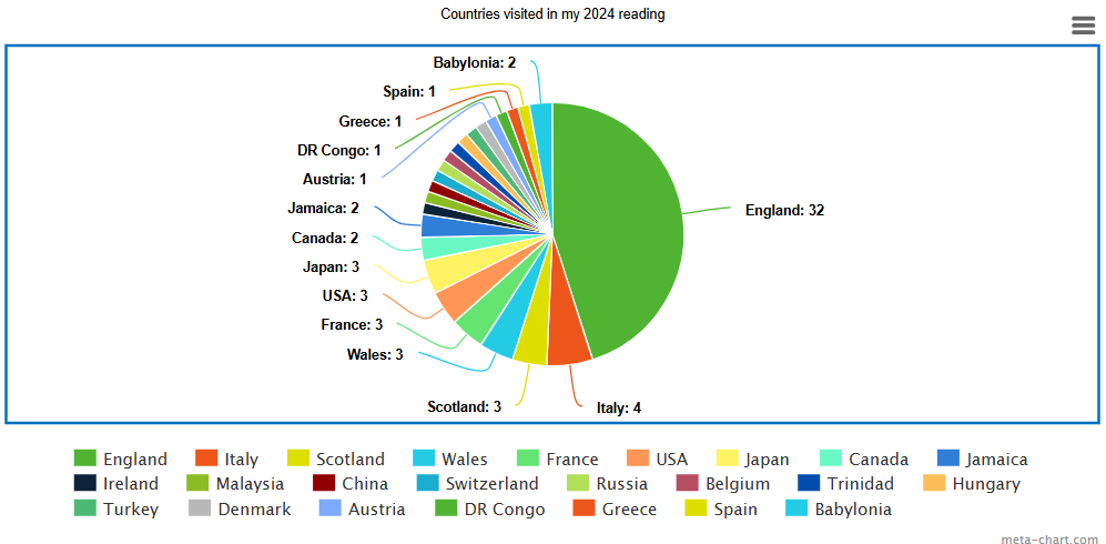This is an improvement on 2023 when I read about 17 countries. England still dominates, but I’m pleased to have read about such a wide variety of other countries as well, even if there were just one or two books set in each. I’ve included Babylonia as a country here, although it was actually an ancient state located in modern day Iraq, Iran and Syria.