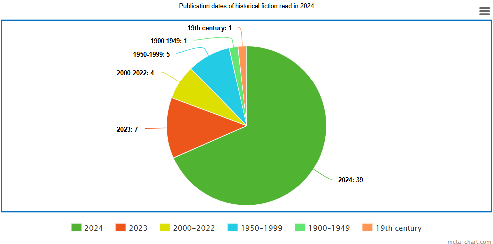Welcome to my monthly post on all things historical fiction. For my first Musings post of the year, I am looking back at the historical fiction I read in 2024 and have put together my usual selection of charts and lists! I have kept most of the same categories I’ve used for the previous eight years so that it should be easy to make comparisons and to see if there have been any interesting changes in my reading patterns and choices (here are my posts for 2023, 2022, 2021, 2020, 2019, 2018, 2017 and 2016).