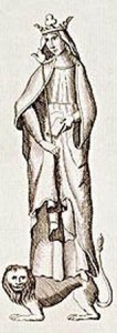 So, what exactly are these marginal illustrations? Well, many of them depict birds and animals such as dogs, lions, ‘pards’ (the name given to large leopard-like cats), crows, foxes, mythological beasts such as dragons – anything that might have appeared in a medieval bestiary. These creatures add extra meaning to the central panels; for example, a dog is shown howling below the picture of Edward the Confessor being taken to his burial. Others display fear, joy, pride, anger or other appropriate emotions at relevant points in the Tapestry. The margins also include illustrations of some of Aesop’s Fables; the story of ‘the Fox and the Crow’ is one of them. In order to understand the significance of the fables and the other messages we are being given in the margins, it helps if we know who embroidered these images, who commissioned the Tapestry in the first place and who the intended audience was, and Wright spends a lot of time discussing these things as well as interpreting the images themselves.